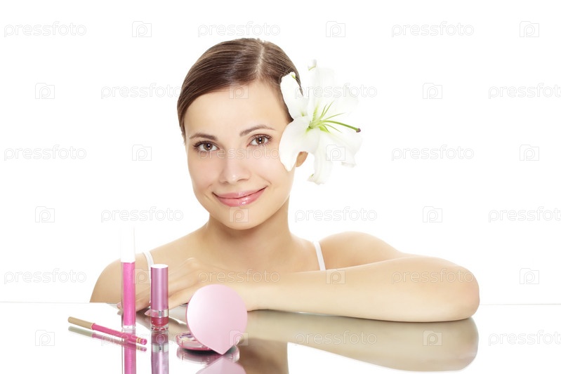 Девушка с косметикой, на белом фоне