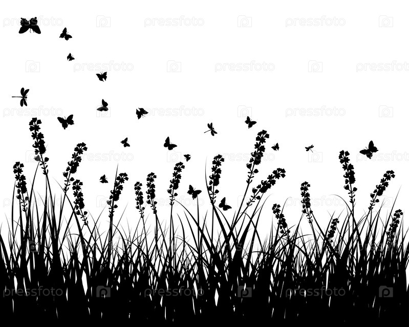 Черные силуэты травы и бабочек на белом фоне