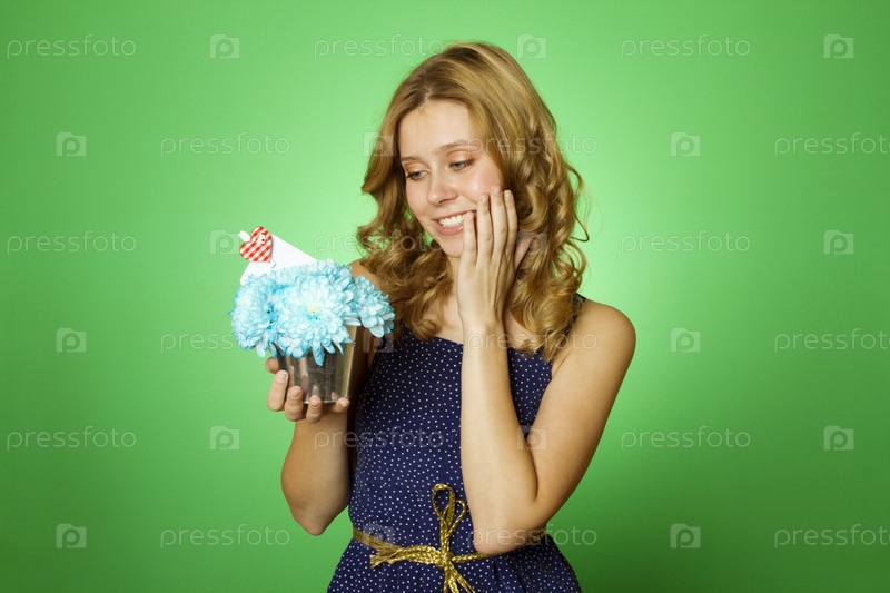 Молодая женщина с букетом голубых хризантем читает поздравительную открытку