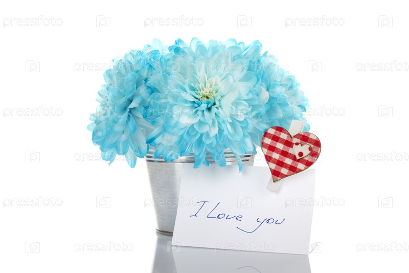 Букет из синих хризантем с любовной запиской на белом фоне
