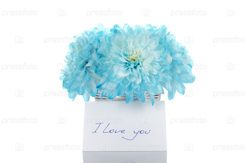 Букет из синих хризантем с запиской на белом фоне