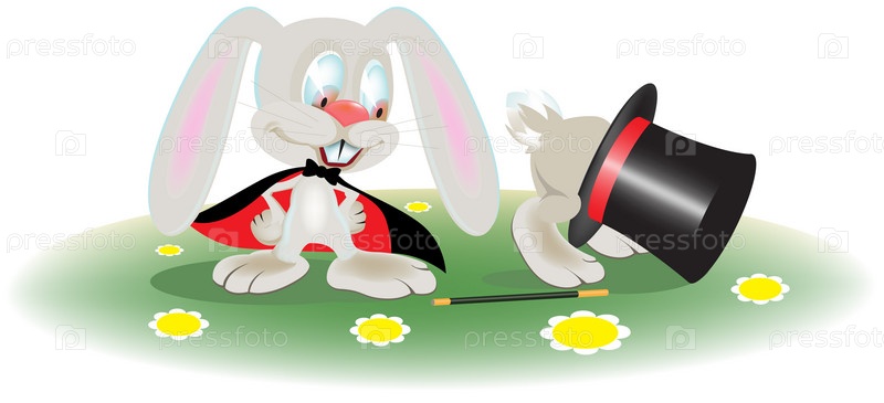 Два кролика на лужайке с атрибутами фокусника