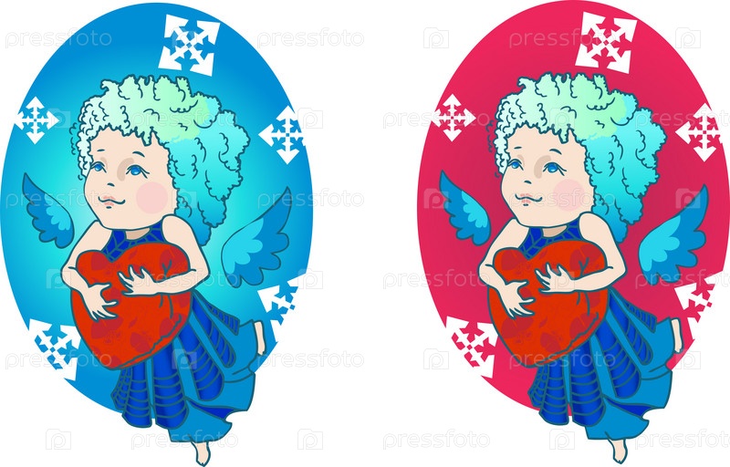 Симпатичный ангел с красным сердцем на синем и красном фоне