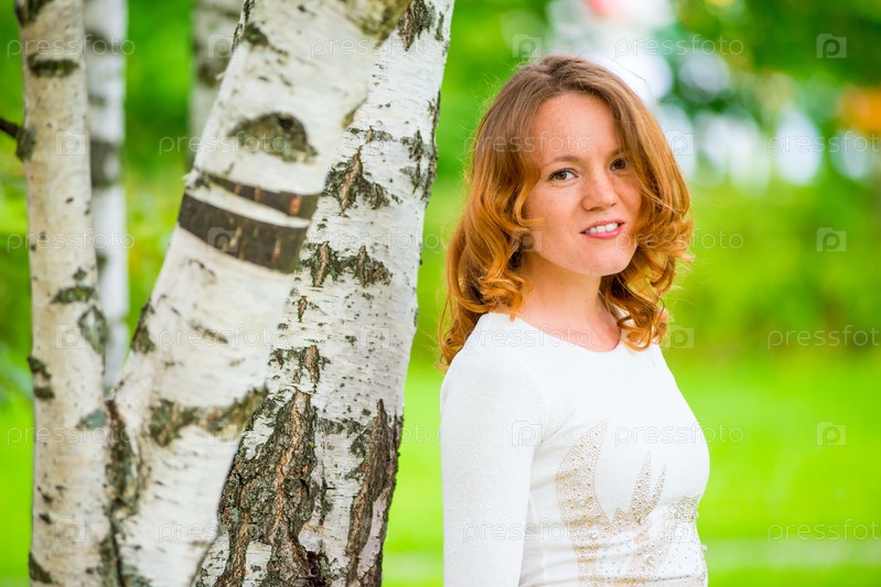 Рыжеволосая молодая женщина позирует в парке