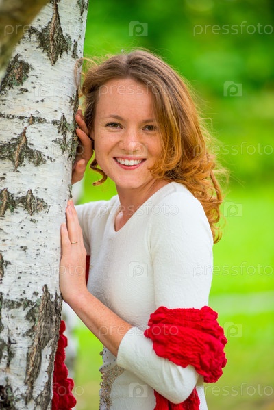 Рыжеволосая молодая женщина позирует в парке