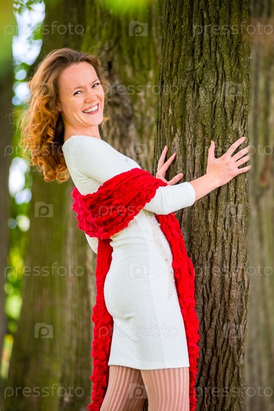 Рыжеволосая молодая женщина позирует в парке