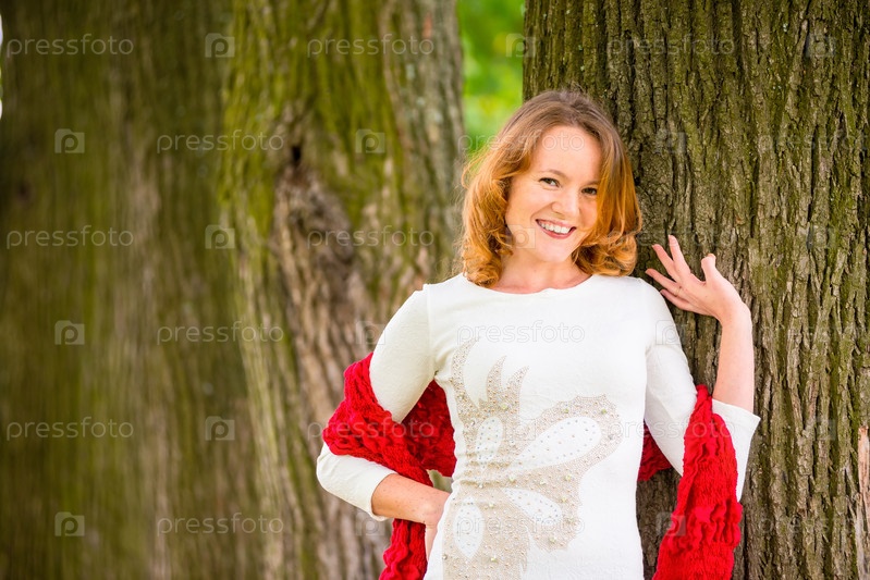 Рыжеволосая молодая женщина позирует в парке