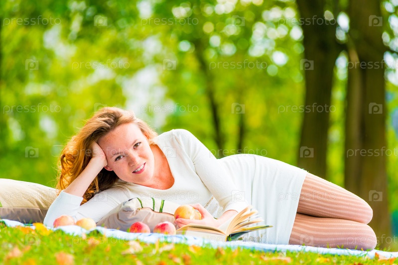 Счастливая девушка с книгой в парке