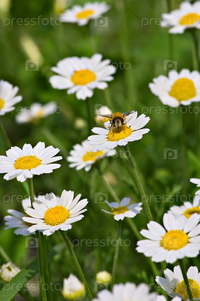 Мелкие ромашки и муха-пчеловидка, сидящая на них