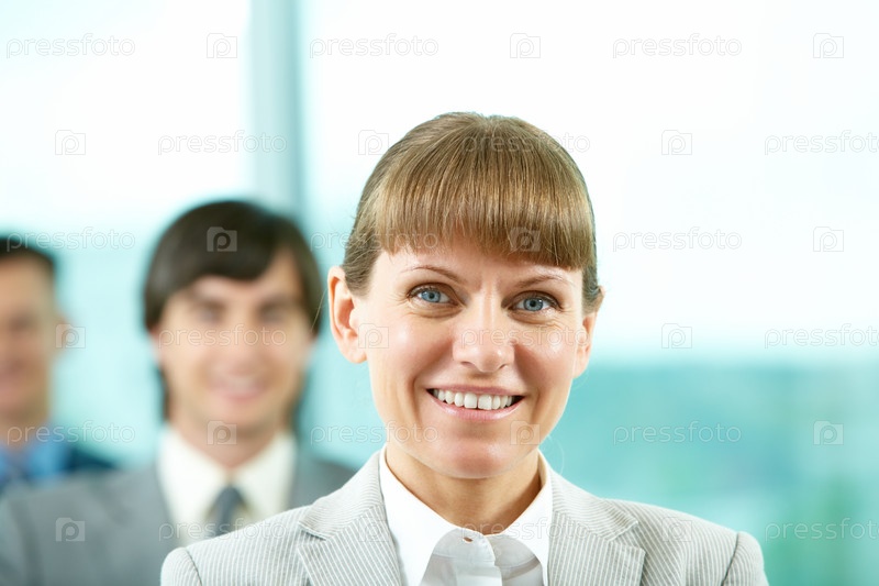 Улыбающаяся деловая женщина в офисе с коллегами