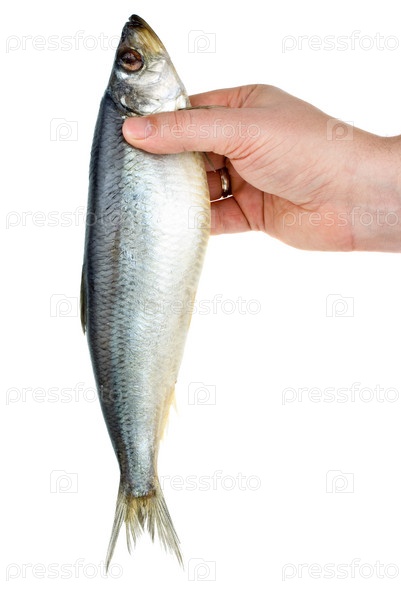 Рука держит соленую сельдь на белом фоне
