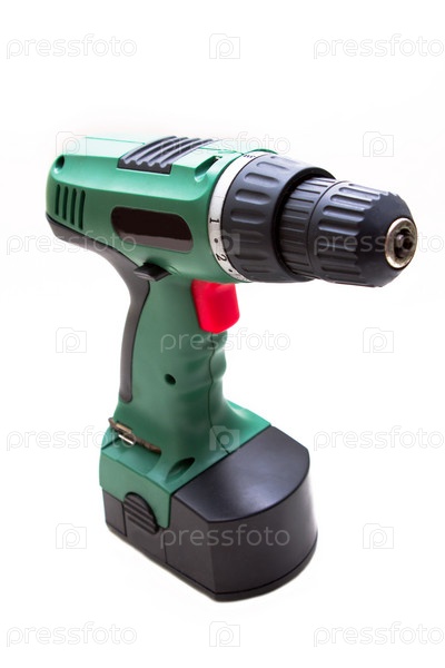 Аккумуляторная дрель крупным планом, на белом фоне