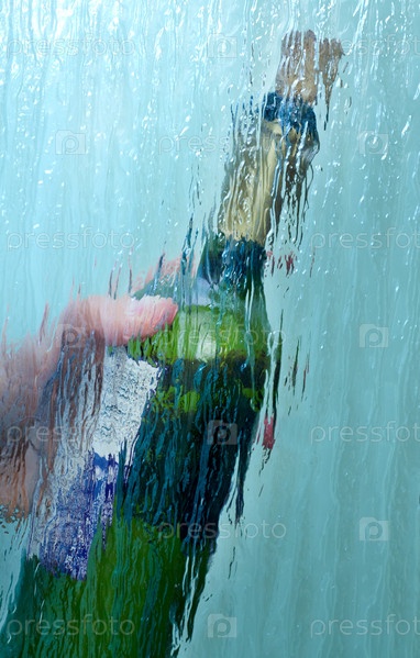 Бутылка вина в руке, вид сквозь мокрое стекло