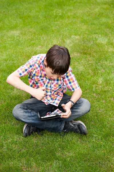 Мальчик с планшетным компьютером сидит на зеленой лужайке