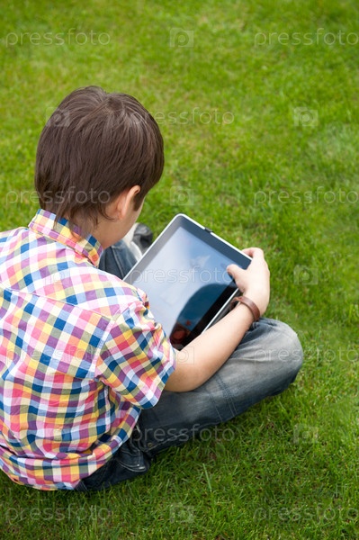 Мальчик с планшетным компьютером сидит на зеленой лужайке