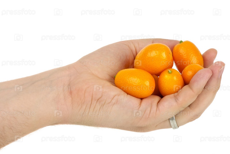 Несколько плодов кумквата в руке. Белый фон