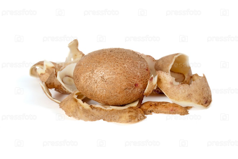 Целая картофелина и очистки на белом фоне