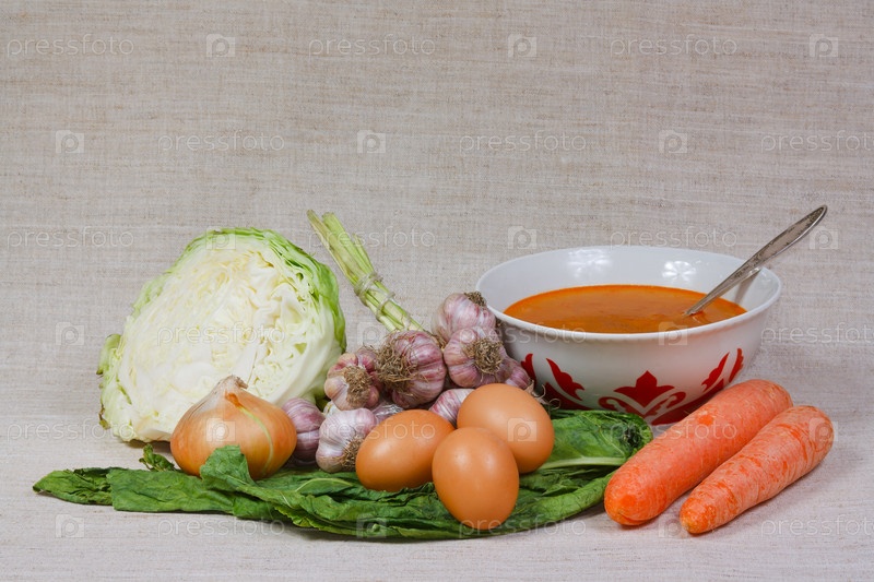 Свежие овощи, яйца и тарелка супа на сером фоне