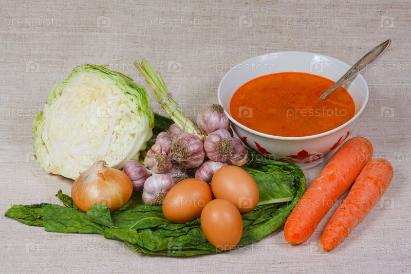 Свежие овощи, яйца и тарелка супа на сером фоне
