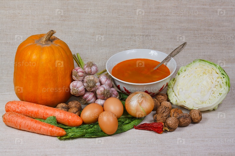 Свежие овощи, яйца и тарелка супа на сером фоне