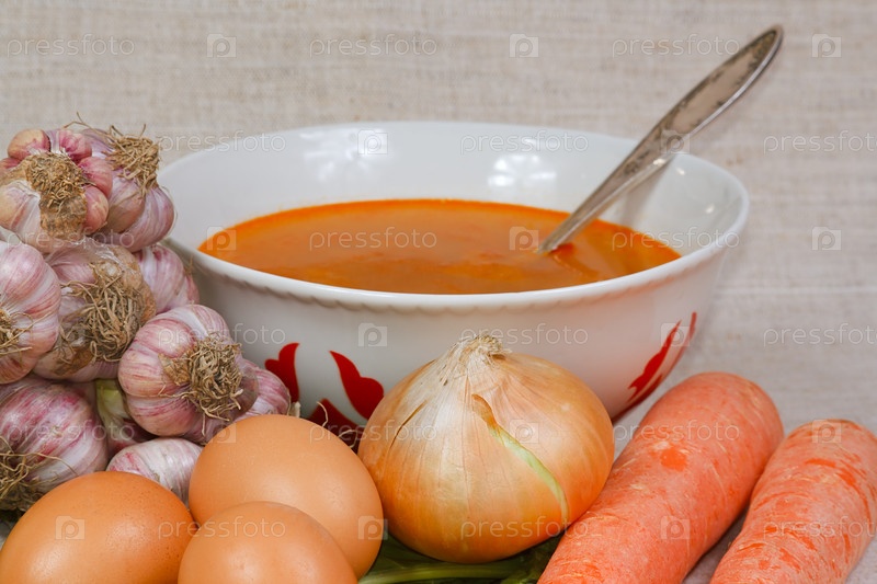 Свежие овощи, яйца и тарелка супа на сером фоне