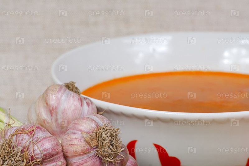 Чеснок и тарелка супа на сером фоне