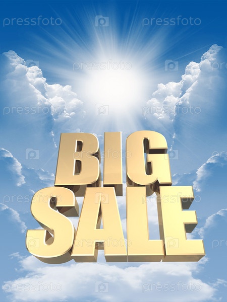 Надпись 'Большая продажа' на голубом солнечном небе, иллюстрация
