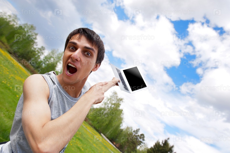 Счастливый молодой человек с ноутбуком на фоне природы