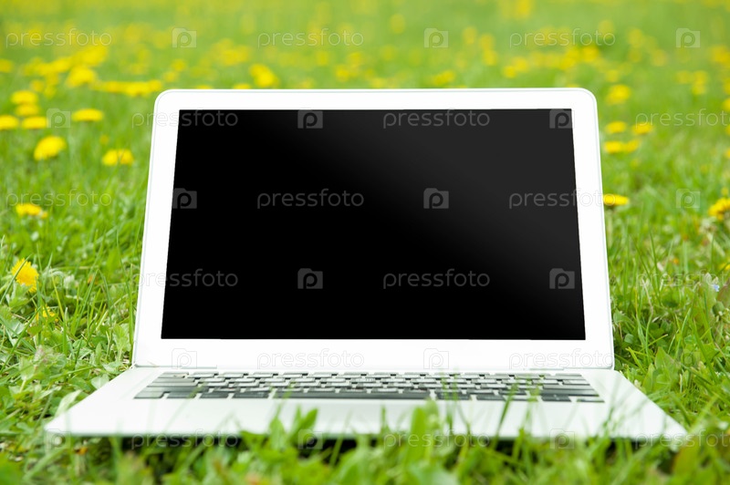 Ноутбук на траве, крупный план