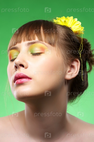 Портрет красивой девушки с цветком волосах на зеленом фоне