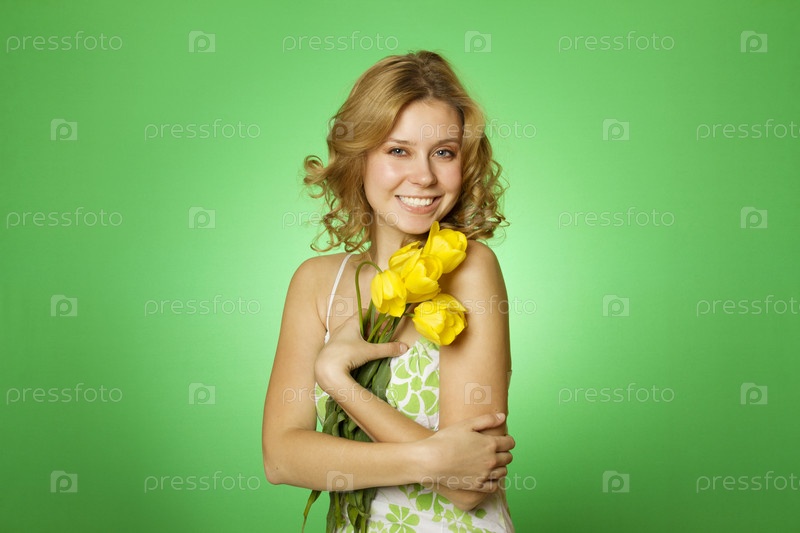 Молодая счастливая девушка с букетом тюльпанов на зеленом фоне