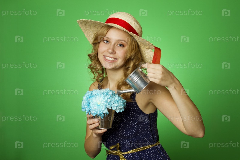 Молодая счастливая девушка с букетом хризантем на зеленом фоне