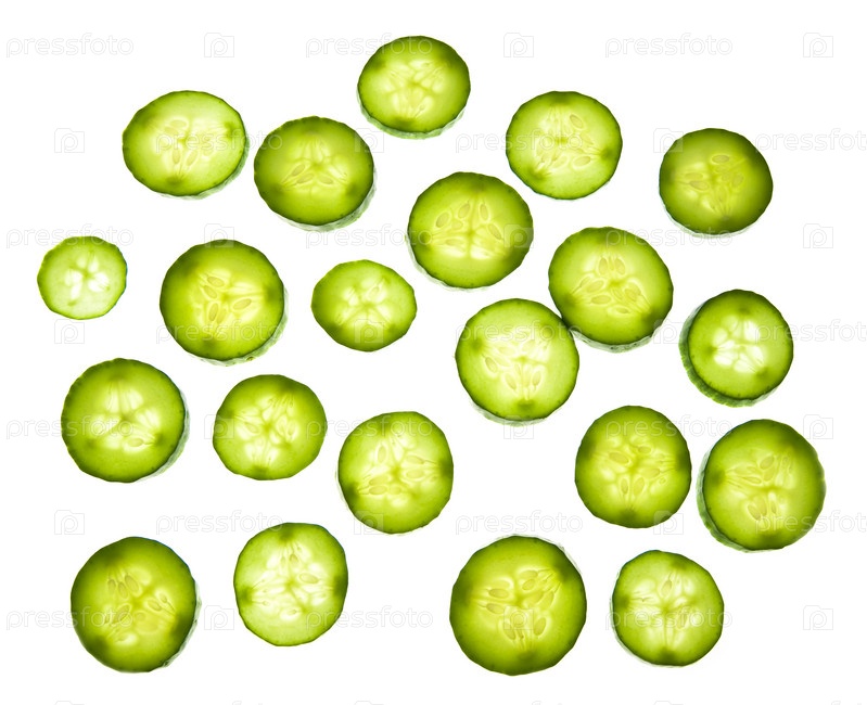 Сочные кольца огурцов хаотично расположены на белом фоне
