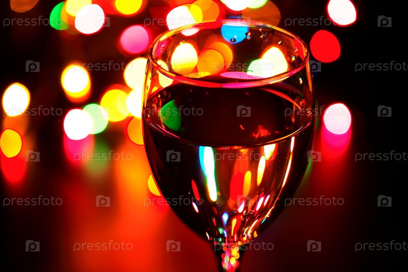 Бокал с напитком на фоне размытых огней гирлянды