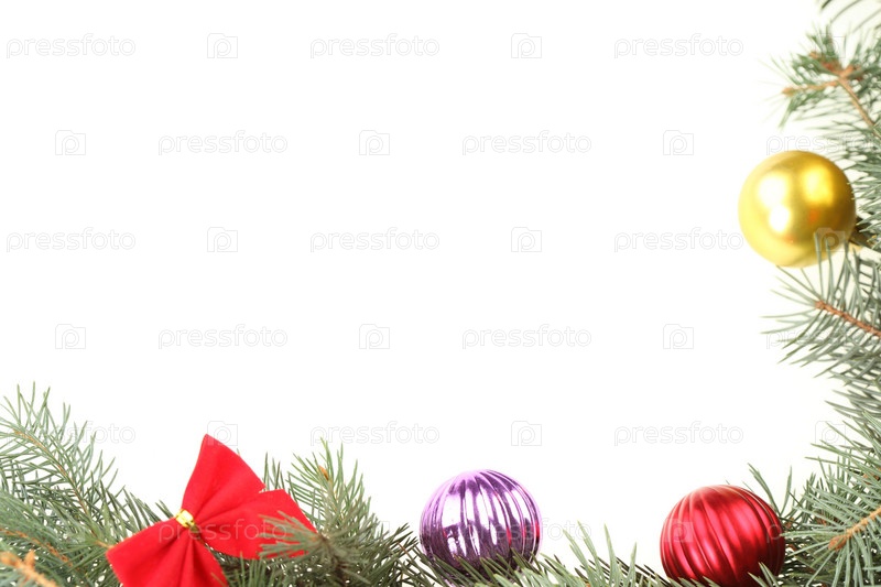 Еловая ветка с шарами, изолированная на белом фоне