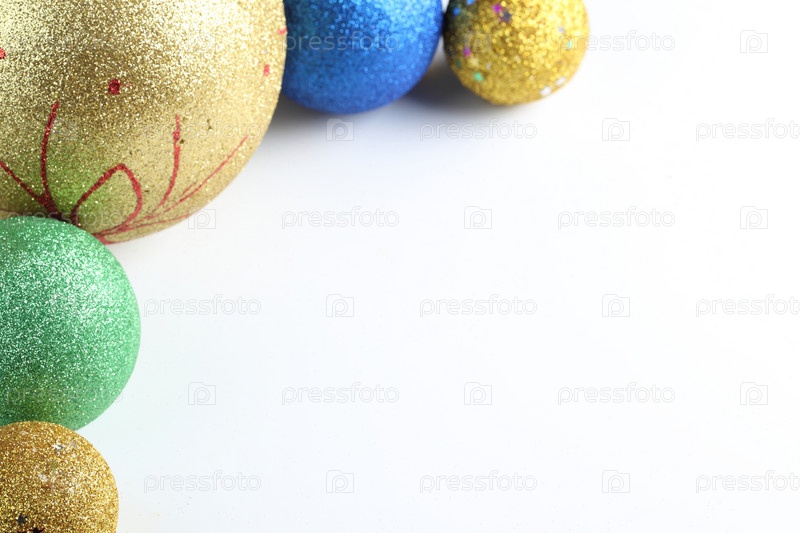 Несколько блестящих елочных игрушек на белом фоне