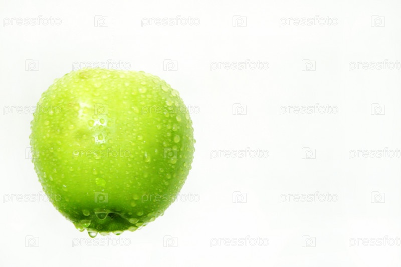 Зеленое яблоко с каплями воды на белом фоне