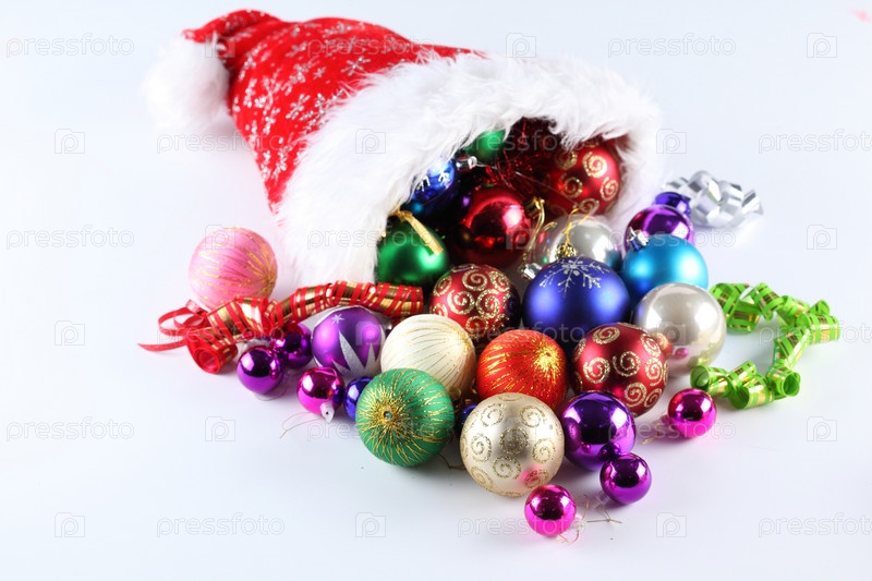 Множество елочных игрушек в новогоднем колпаке