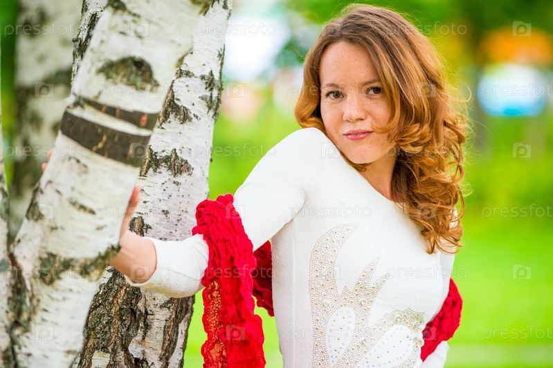 Рыжеволосая девушка в белом платье возле березы