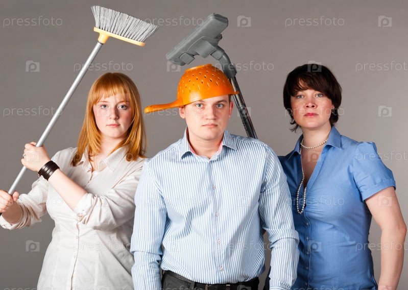 Деловые люди с пылесосом и щеткой