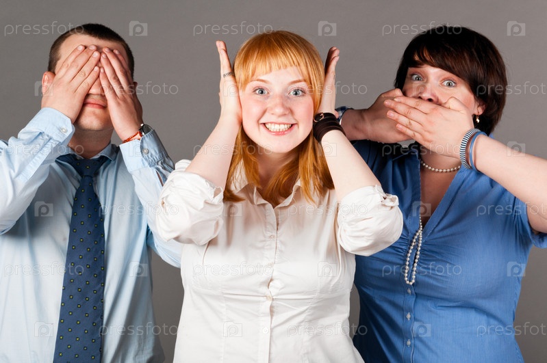 Глухой, немой, слепой: три офисных работника на сером фоне