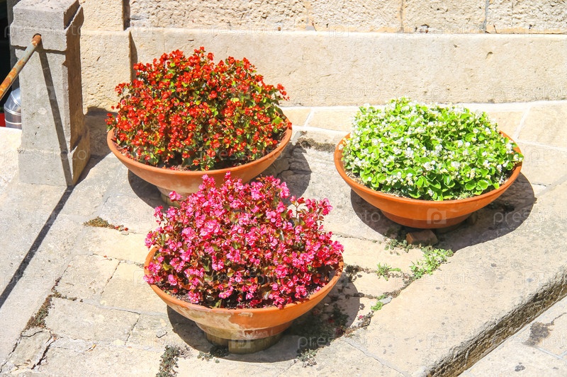 Три вазона с бегониями на тротуаре итальянского города
