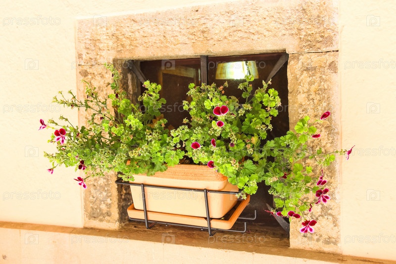 Ящик с цветами украшает стену дома