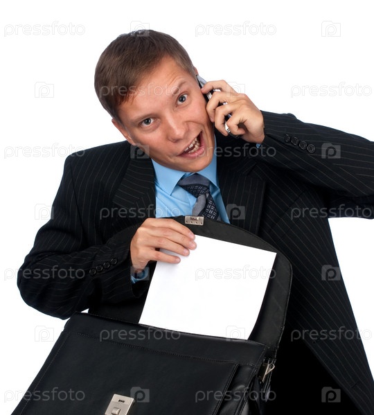 Молодой бизнесмен с портфелем говорит по телефону
