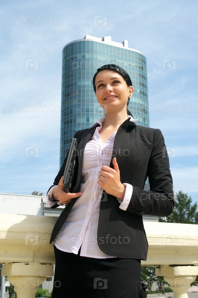 Девушка в деловом костюме на фоне бизнес-центра