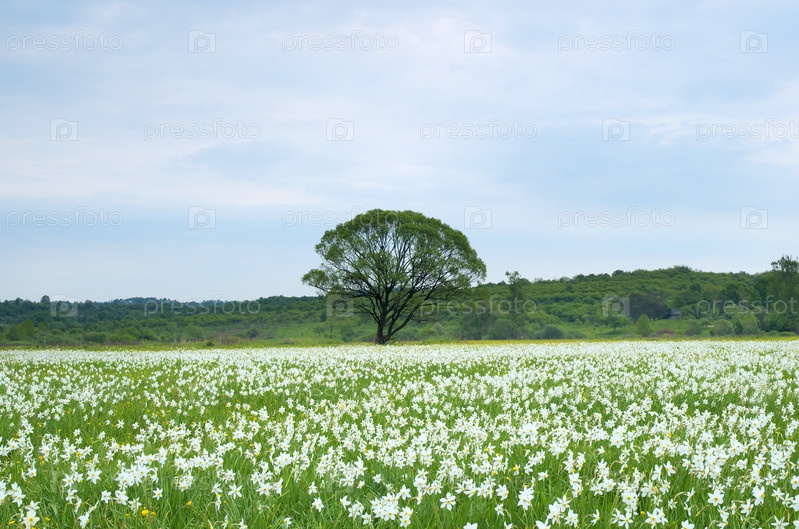 Одинокое дерево, растущее среди поля с цветущими нарциссами