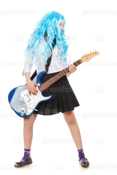 Девушка-подросток в синем парике играет на гитаре, изолирована на белом