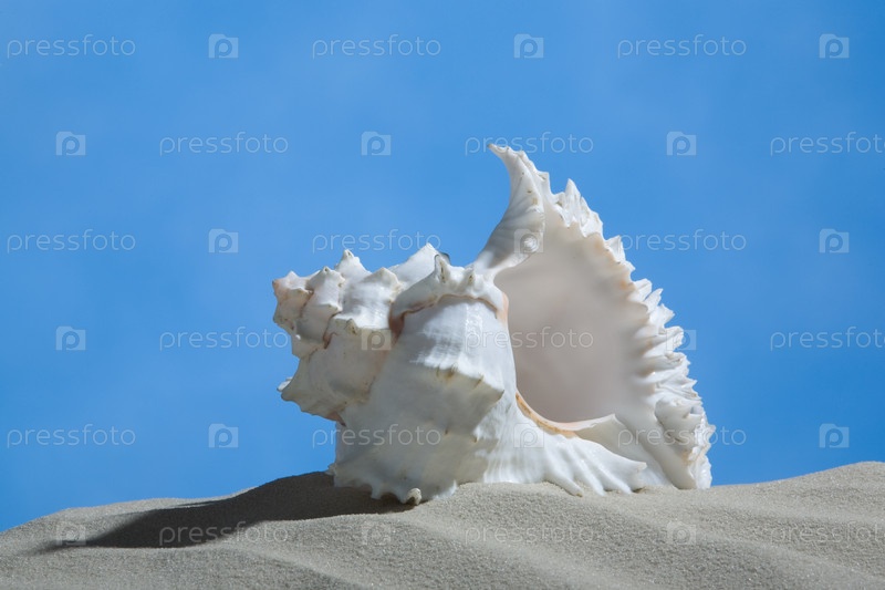 Морская ракушка на фоне голубого неба. Крупный план