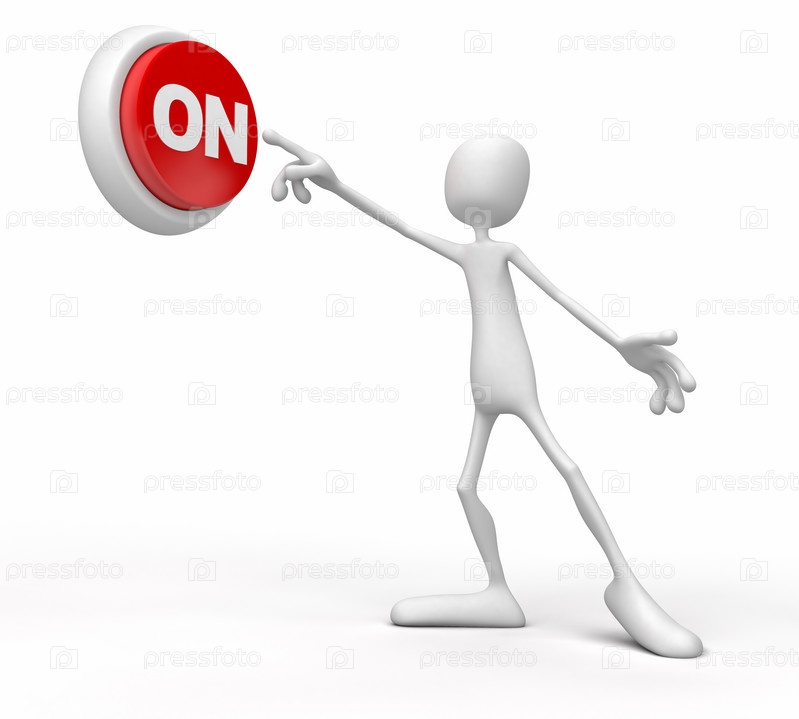 Маленький человек нажимает кнопку 'Включить'