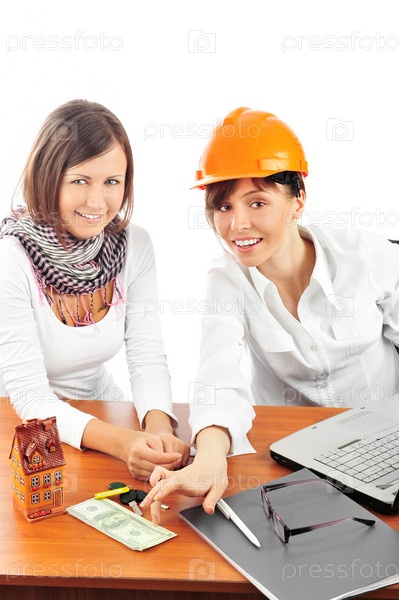 Портрет двух молодых женщин, обсуждают проект строительства